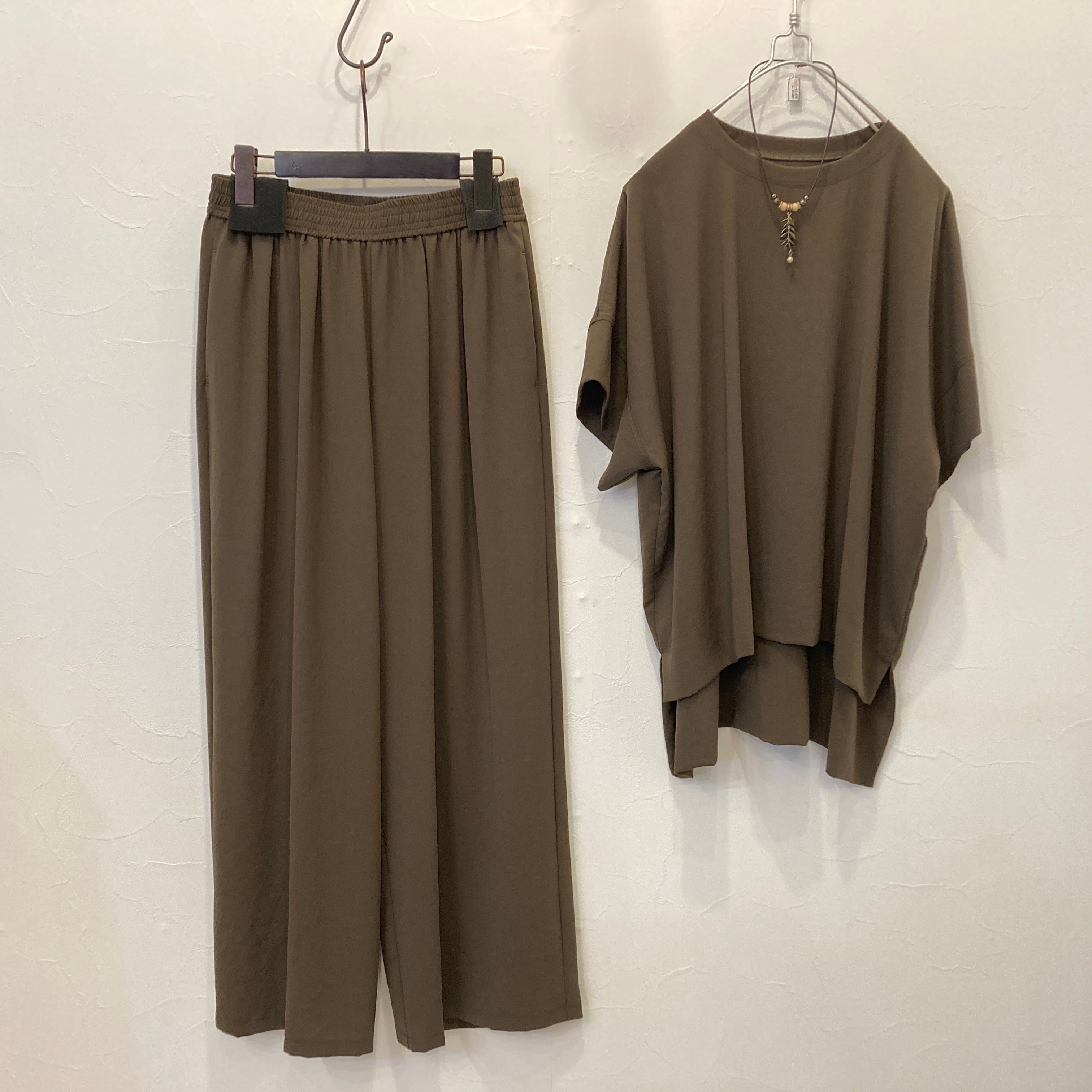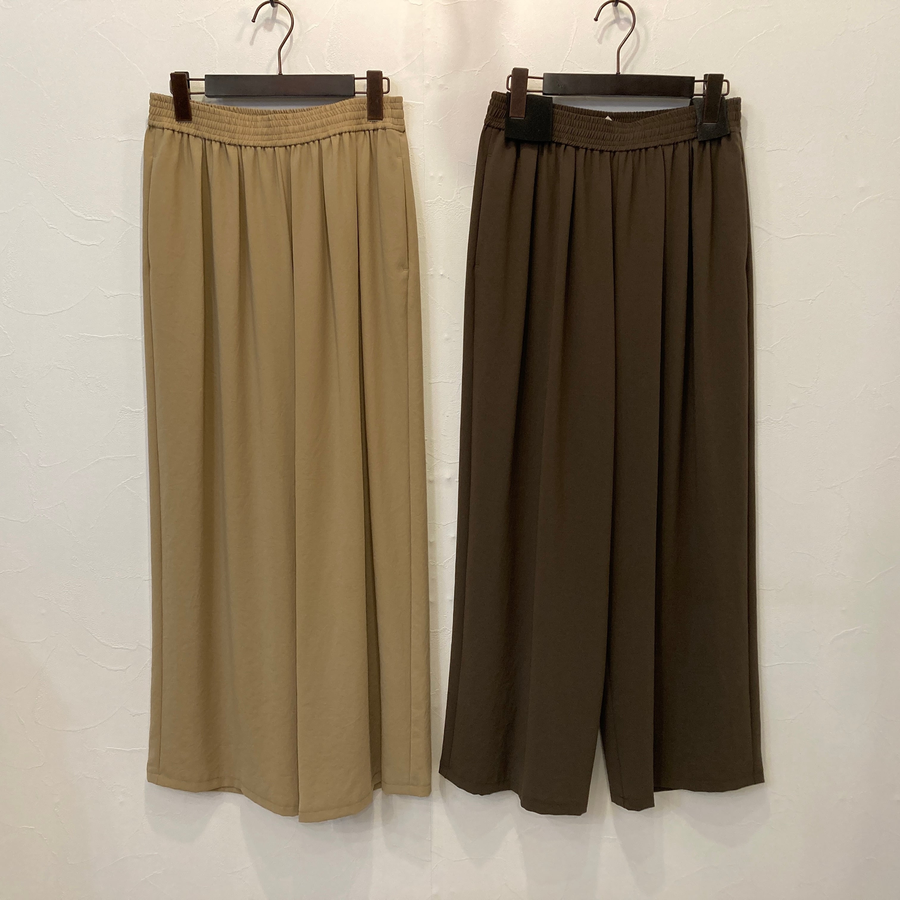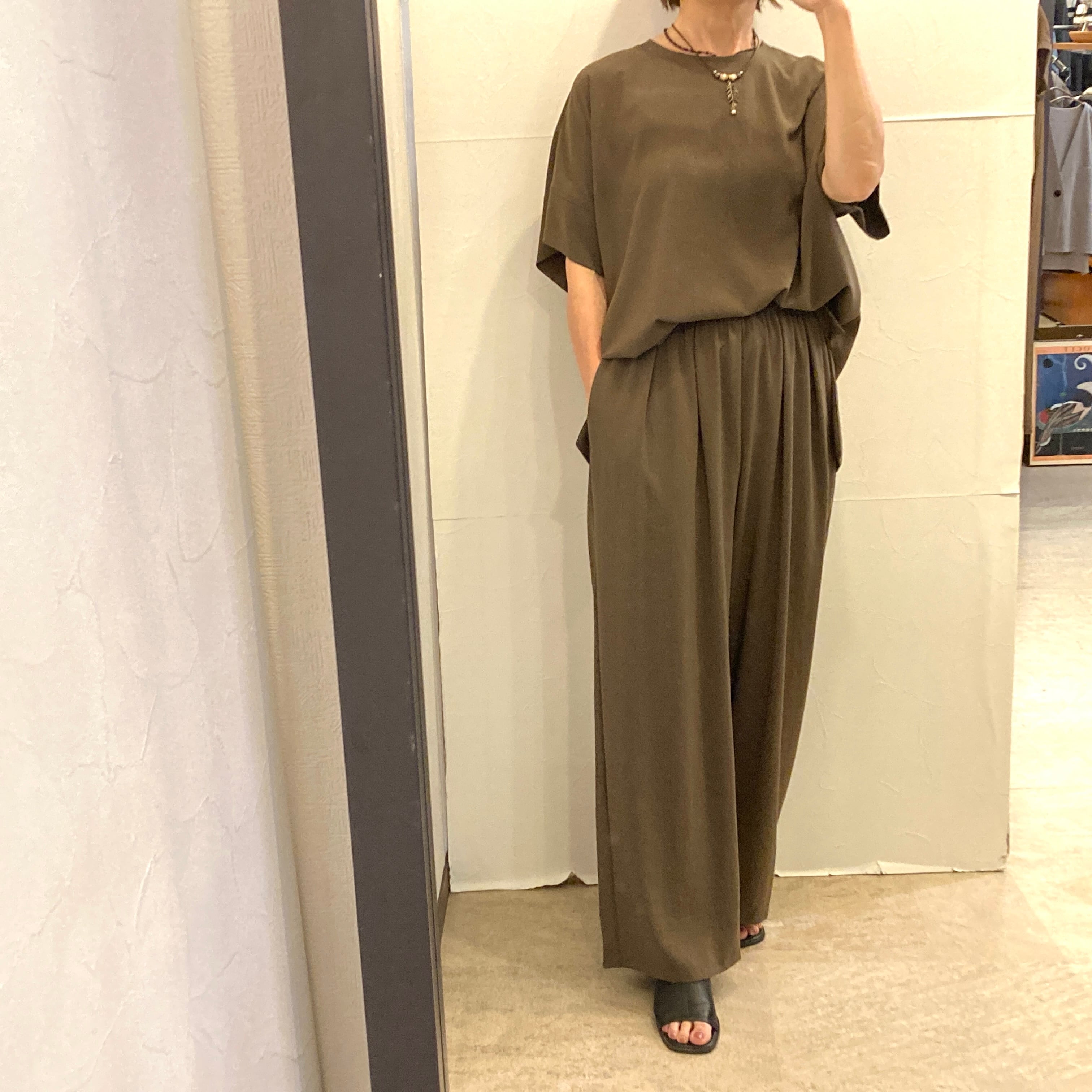 秋のコーデにぴったりの、さらっとした薄手素材のワイドパンツです。美しいシルエットと抜群の履き心地、シワにもなりにくいのでオススメのボトムです。同じ素材のプルオーバーとセットアップコーデも楽しめます。