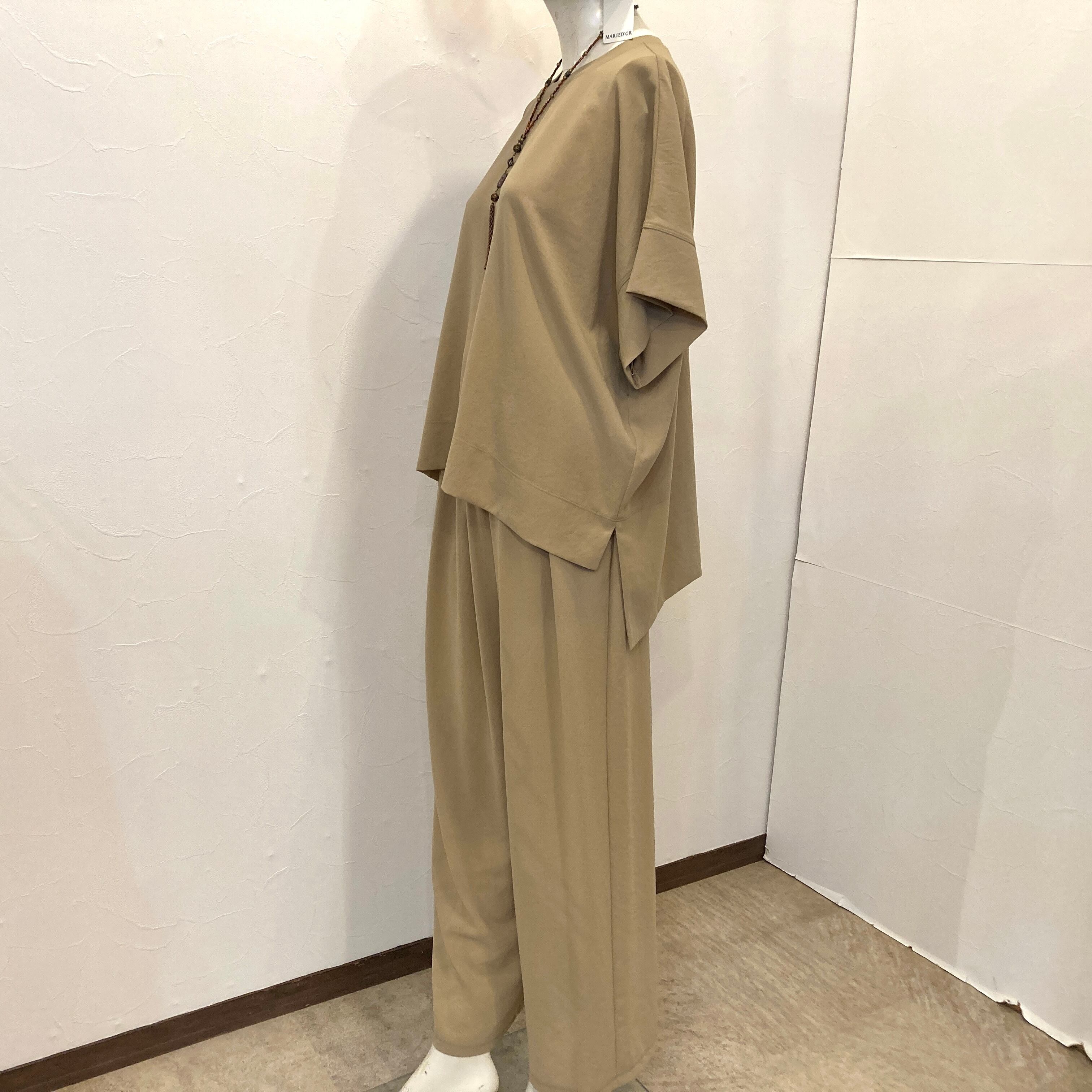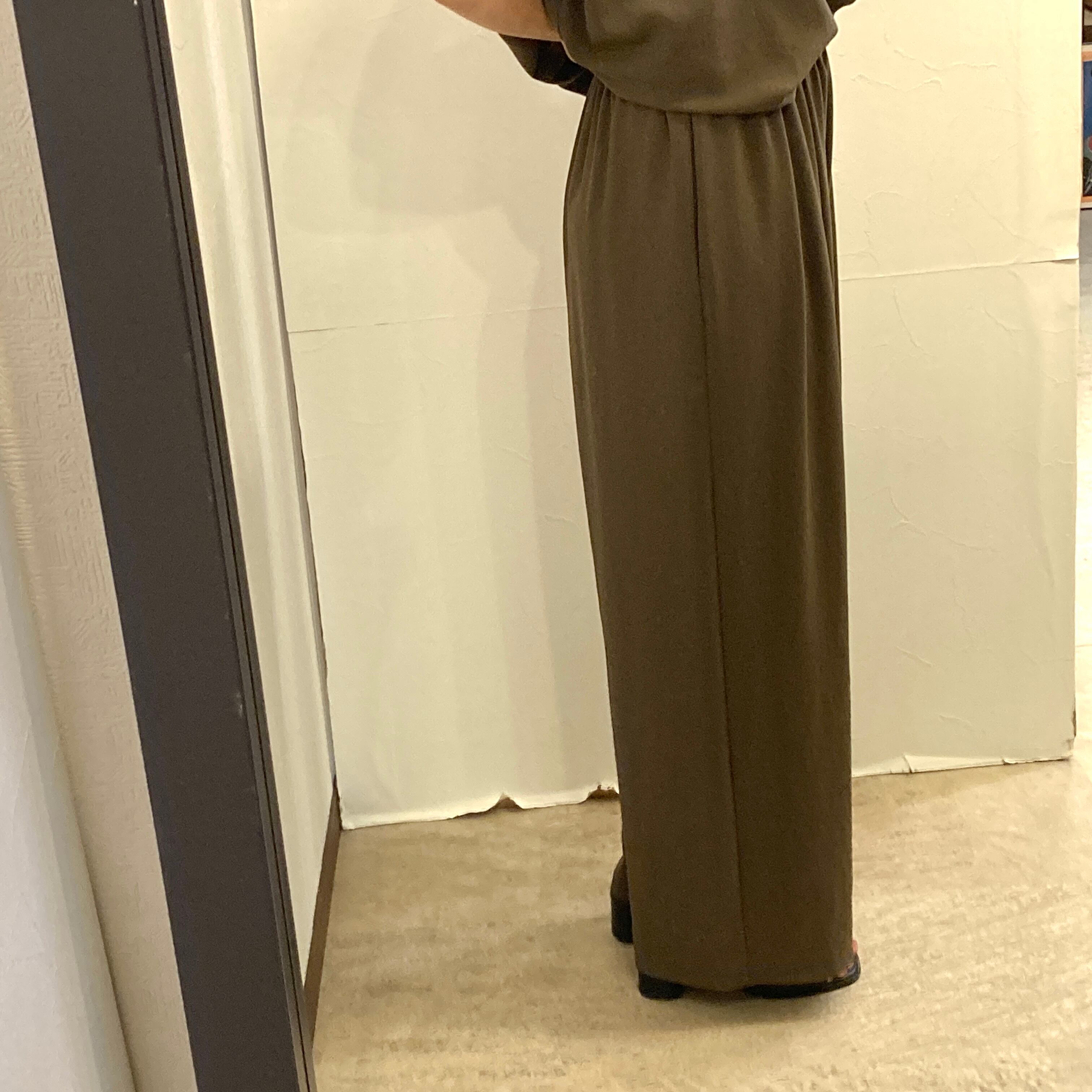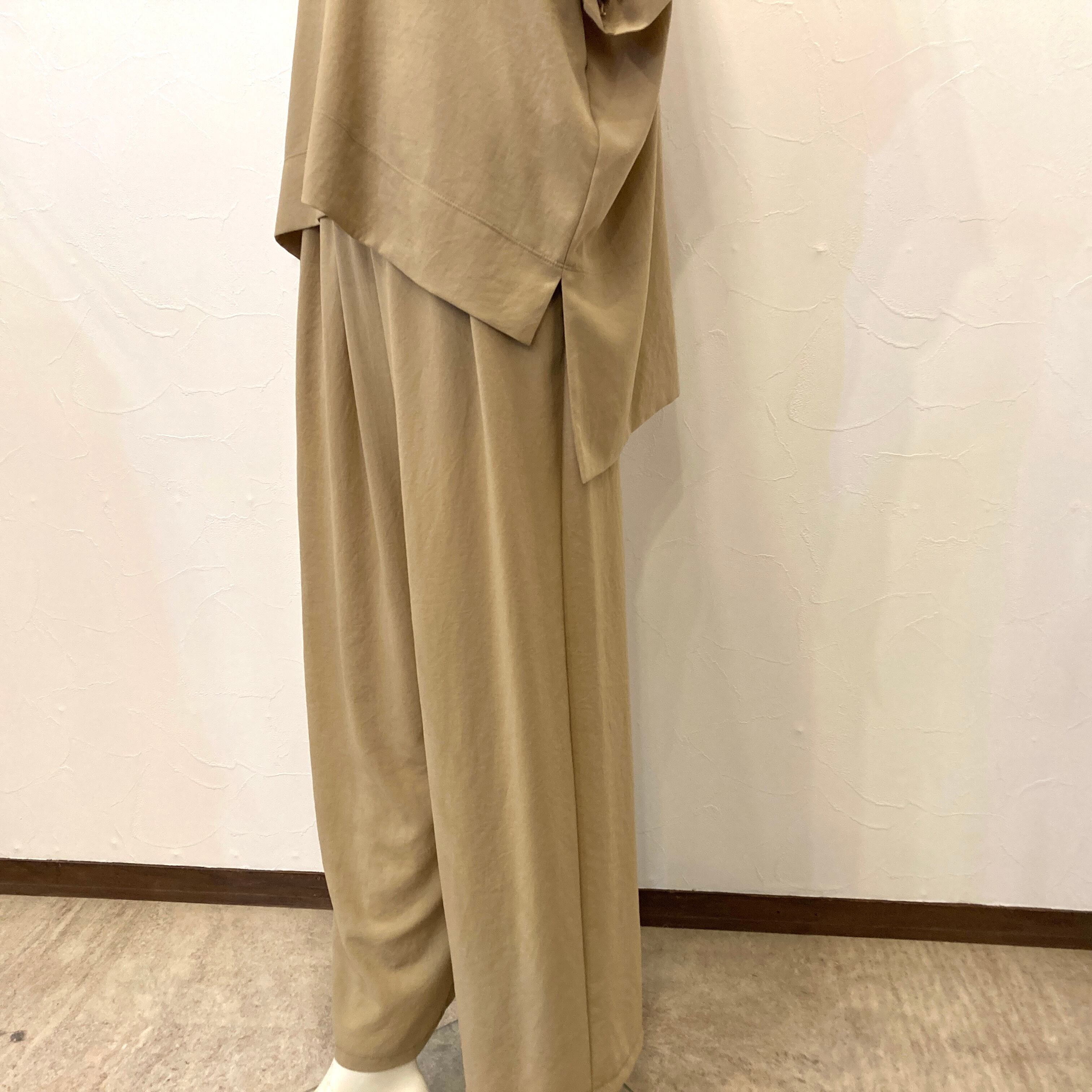 秋のコーデにぴったりの、さらっとした薄手素材のワイドパンツです。美しいシルエットと抜群の履き心地、シワにもなりにくいのでオススメのボトムです。同じ素材のプルオーバーとセットアップコーデも楽しめます。