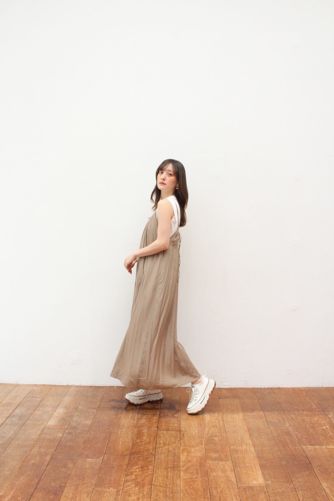 脇が見えにくいノースリーブTシャツがセットになったビスチェジャンスカです!落ち感のある素材がシルエットを美しく引き立てており、エレガントな印象を与えます。丈は肩紐の調節が可能で、自分好みのスタイルにアレンジできるのも嬉しいポイントです。裏地付きで透けにくく、一枚で安心して着用できるアイテムです。カジュアルからちょっとしたお出かけまで幅広いシーンでご活用いただけます。